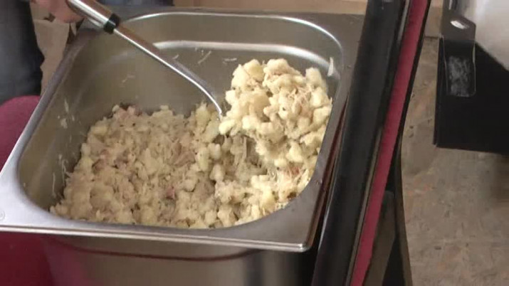 Jelena Kováčová, spoluorganizátorka: "Je to cikánský chleba a velice jednoduchý recept. Tam je jenom voda, sůl a mouka. To je všechno a opéká se to na plotně nasucho. To jsou holubky, to je zelný list a do něho zabalené mleté maso s rýžou. To je takové tradiční romské jídlo a halušky jsou s uzeným a se zelím kysaným."