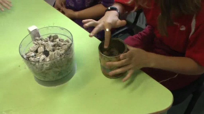 Školáci a uživatelé dílen Sagapo: "My děláme papír, míchá se to, barva, lepidlo." "My trháme toaletní papír, pak dáme do toho vodu, pak se to zamíchá, pak se tam dá lepidlo, barva, zamíchá se to, pak se sem dají ručníky a pak se to vyrábí."