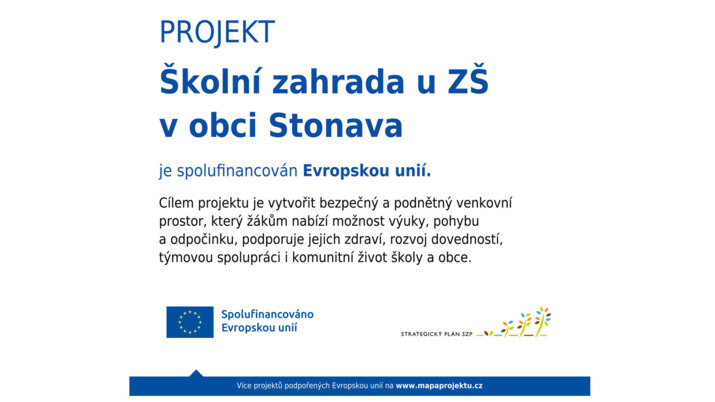 Obec, jako zřizovatel Základní a mateřské školy Stonava, vybudovala moderní školní zahradu s jasným cílem: poskytnout žákům kvalitní venkovní prostředí pro výuku a rozvoj praktických dovedností, podpořit pobyt dětí venku v bezpečném, funkčním a atraktivním prostředí a přispět tak k fyzickému, duševnímu i sociálnímu rozvoji stonavských dětí.