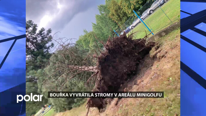 Sobotní bouřka a silný vítr takto hravě vytrhl i s kořeny jeden ze stromů v areálu minigolfu a poškodil i druhou borovici. Naštěstí návštěvníci ze sportoviště stihli před bouřkou odejít, nebo se schovali pod přístřešek.