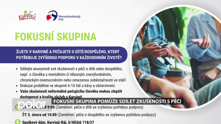 Žijete v Karviné a pečujete o dítě nebo dospělého, který potřebuje zvýšenou podporu v každodenním životě? Nyní můžete tyto své zkušenosti sdílet anonymně v rámci fokusní skupiny o šesti až deseti lidech u kávy a občerstvení. Uskuteční se v úterý 3. února od 9 hodin a ve čtvrtek 5. února od 16 hodin ve Spolkovém domě v Karviné-Ráji.