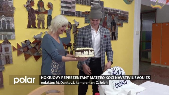 Matteo Kočí, hokejista české juniorské reprezentace, se hned při vstupu do své Základní školy Prameny v Karviné přivítal s vedením školy a také se svou bývalou třídní učitelkou.