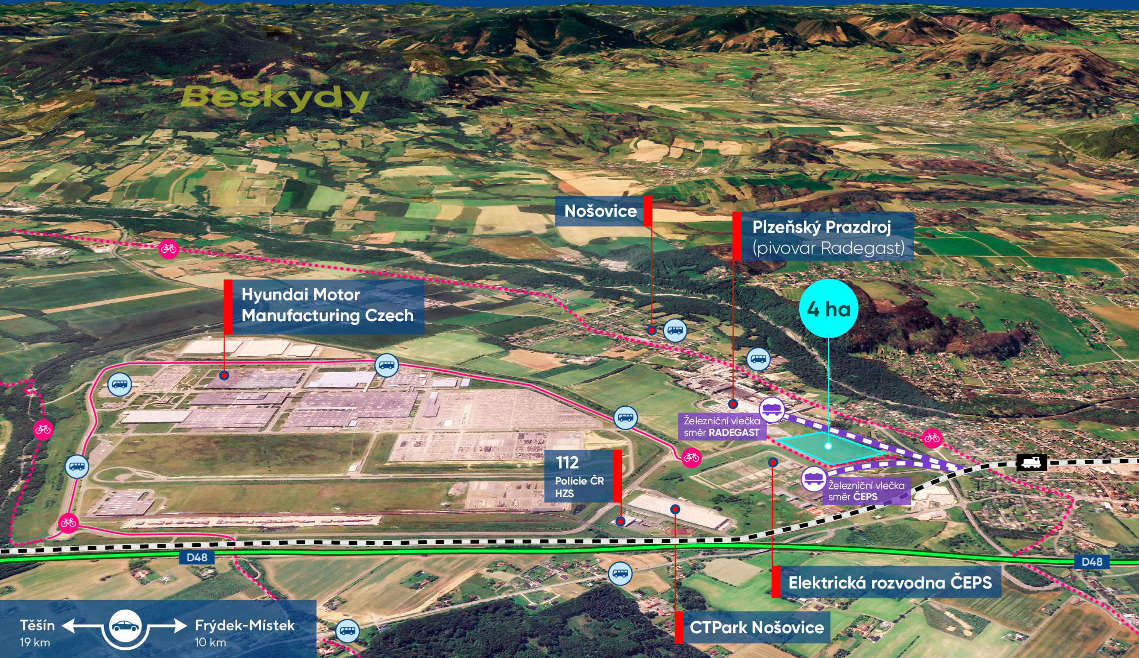 Miroslava Chlebounová, mluvčí MSK: "Pozemky se nacházejí v dynamicky se rozvíjejícím průmyslovém centru regionu – v okolí působí firmy jako CTP, Prosperplast či Plzeňský Prazdroj, v širším okolí pak průmyslové parky Mošnov, Kopřivnice, Hrabová či František. Slovenský výrobní závod automobilky KIA je odtud vzdálen jen 80 kilometrů. Atraktivitu lokality posiluje také blízkost mezinárodních letišť v Ostravě, Katovicích a Žilině."