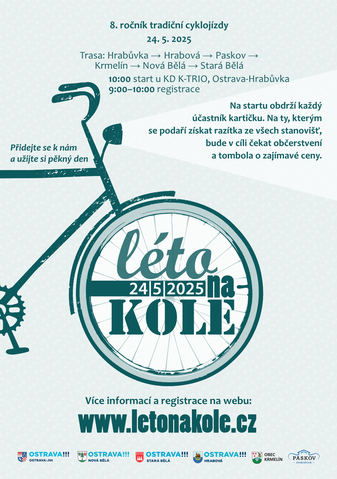 Tradiční cyklojízda Léto na kole letos připadá na sobotu 24. května. Sedmý ročník akce propojí městský obvod Ostrava-Jih s dalšími pěti obcemi a obvody. Trasa povede z Ostravy-Jih přes Hrabovou, Paskov, Krmelín a Novou Bělou do Staré Bělé.
