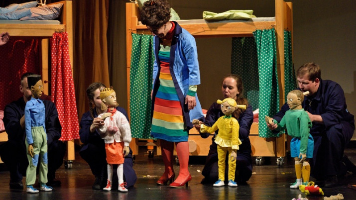 Scéna znázorňuje dětský domov Slunečnice, jeho zahradu se všemožnými atrakcemi, kancelář ředitelky Pralinky nebo kuchyň, která se umí proměnit ve vláček. Inscenace je částečně loutková. Všechny dětské postavy hrají loutky, živí herci ztvárňují postavy dospělé. Dojde také na veselé maňáskové divadlo - na vánoční besídce děti předvedou svou verzi pohádky O Sněhurce a sedmi trpaslících.