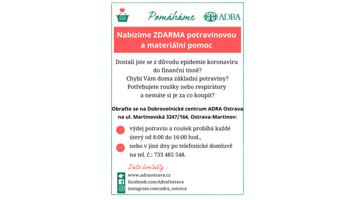 Podobnou výpomoc nabízela Ostravská ADRA už loni na jaře, kdy se řada příjemců ošetřovného dostalo do problémů díky tomu, že jejich dávky přicházely se zpožděním. Po roce se tato cílová skupina rozšířila o další a finanční nouzí trpí stále víc občanů Ostravy. Proto se ADRA rozhodla vyhovět poptávce ze strany městských obvodů i občanů a zřídila v rámci svého Dobrovolnického centra ADRA Ostrava výdejní místo na ulici Martinovská 164 v Ostravě-Martinově. To bude otevřené každé úterý vždy od 8:00 do 16:00 hod., nebo v jiné dny po telefonické domluvě na telefonním čísle 733 485 548. K dispozici budou nejenom základní potraviny, ale i respirátory a chirurgické roušky.